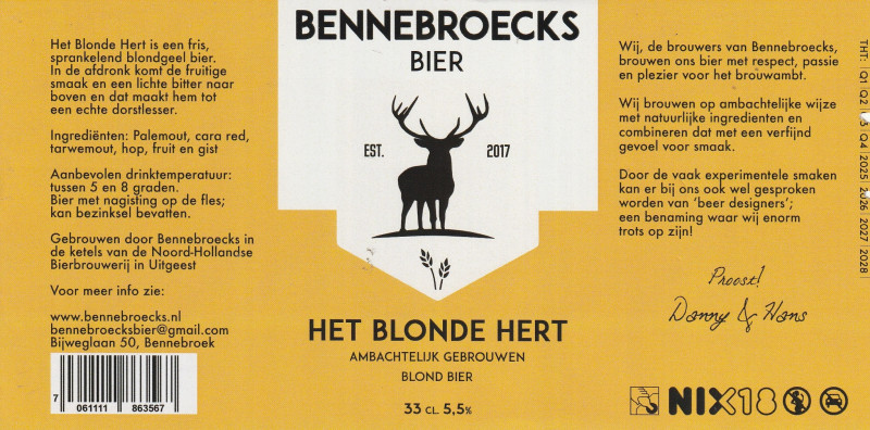 | Omschrijving | tht 03-2026 gebrouwen door Bennebroeks in de ketels van De Noord-Hollandse Bierbrouwerij te Uitgeest |