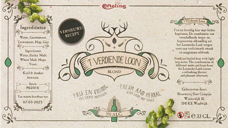 | Biernaam op etiket | 't Verdiende Loon Blond |
