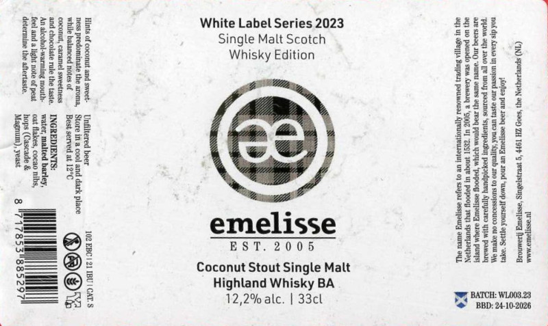 | Biernaam op etiket | White Label Coconut Stout Single Malt Highland Whisky BA |