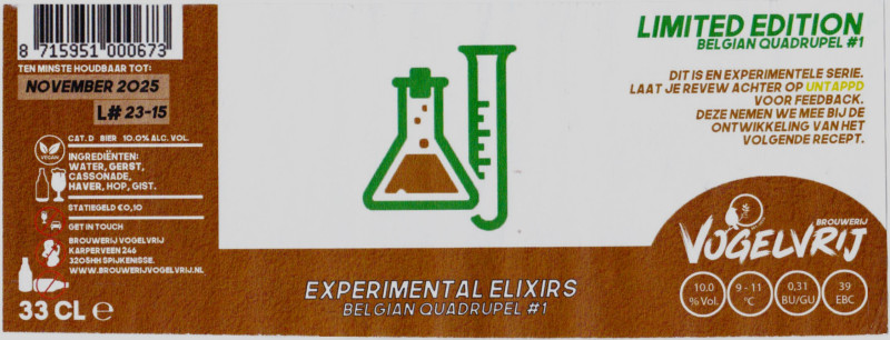 | Biernaam op etiket | Experimental Elixeris Belgian Quadrupel |
