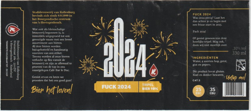 | Biernaam op etiket | 2024 - Fuck 2024 Tripel Bier |