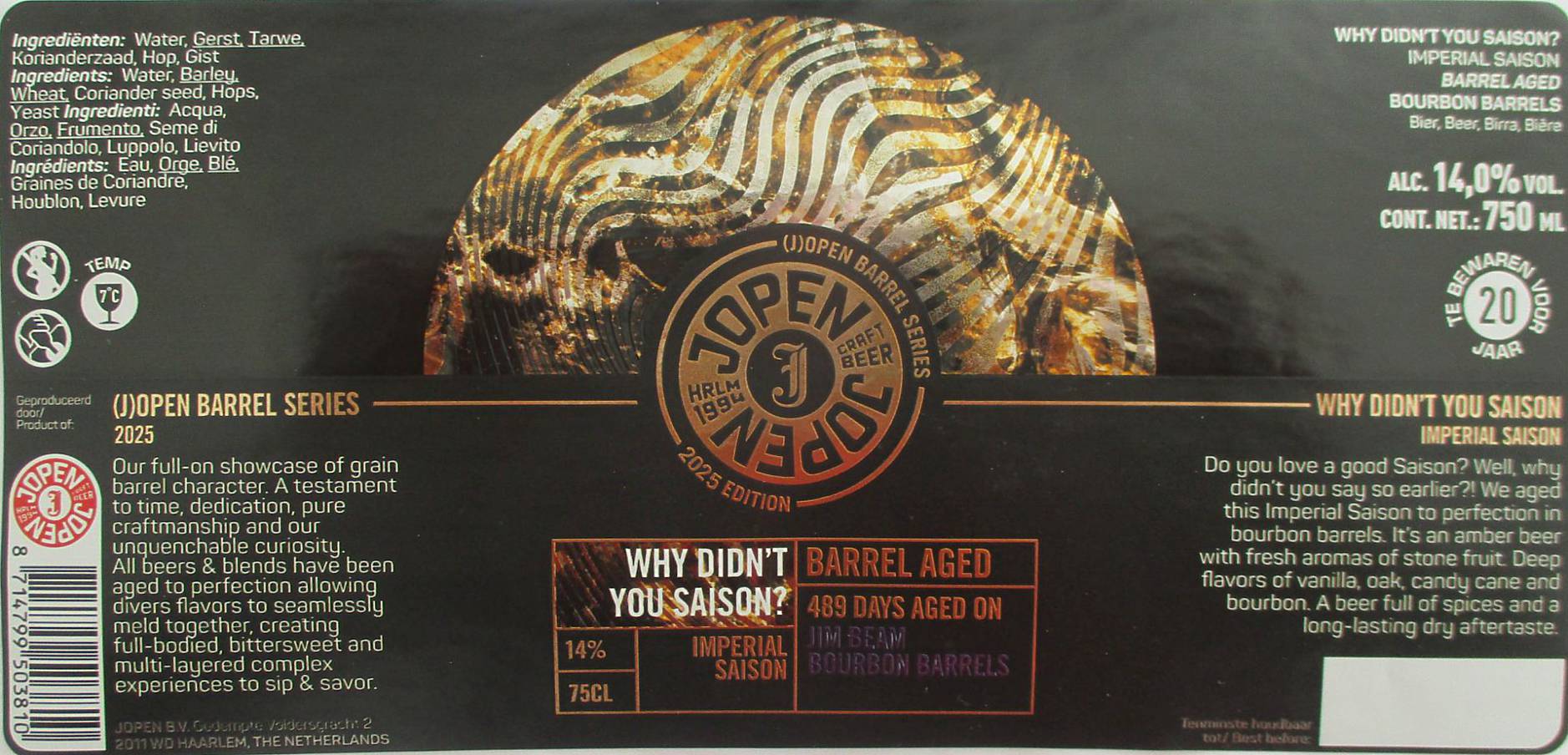 | Omschrijving | Imperial Saison Barrel Aged 489 Days Aged on Jim Beam Bourbon Barrels (J)Open barrels series 2025 |