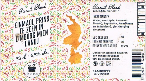 | Biernaam op etiket | Einmaol Prins te zeen in Limburg Mien Landj Biscuit Blond |