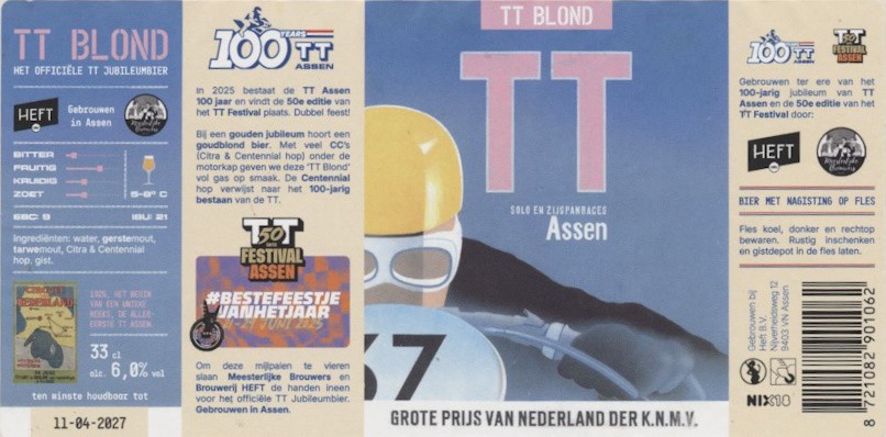 | Omschrijving | Jubileumbier 100 jaar TT en 50e editie TT Festival tht 11-04-2027 Collab - Heft / Meesterlijke Brouwers |