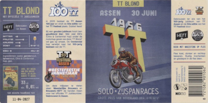 | Omschrijving | Jubileumbier 100 jaar TT en 50e editie TT Festival 30 juni 1956 tht 11-04-2027 Collab - Heft / Meesterlijke Brouwers |
