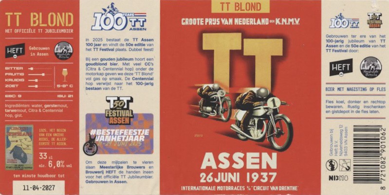 | Omschrijving | Jubileumbier 100 jaar TT en 50e editie TT Festival 26 juni 1937 tht 11-04-2027 Collab - Heft / Meesterlijke Brouwers |