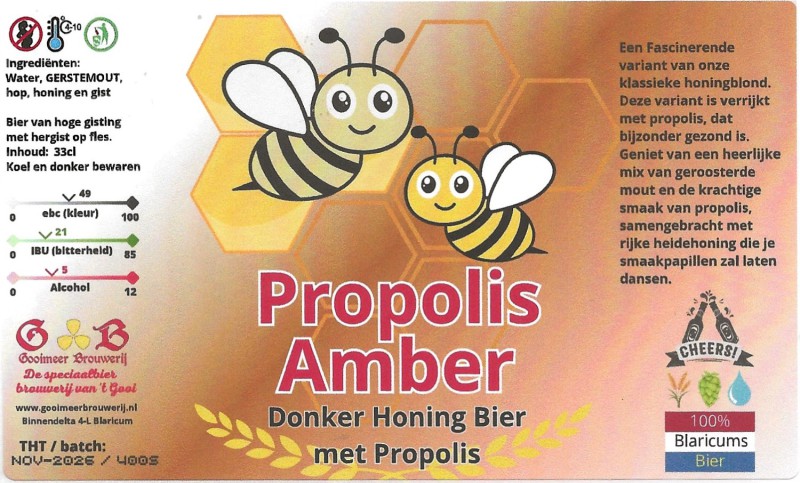 | Omschrijving | Donker Honing Bier met Propolis met geprint data en batch code |