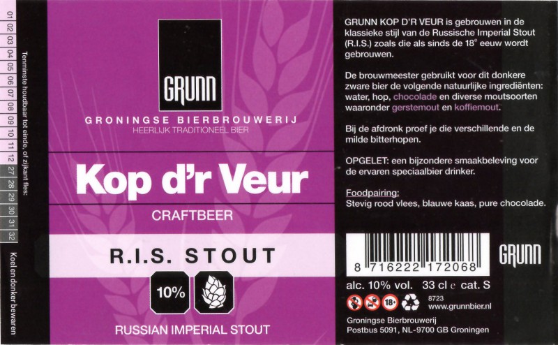 | Biernaam op etiket | Grunn Kop d'r Veur R.I.S. Stout |