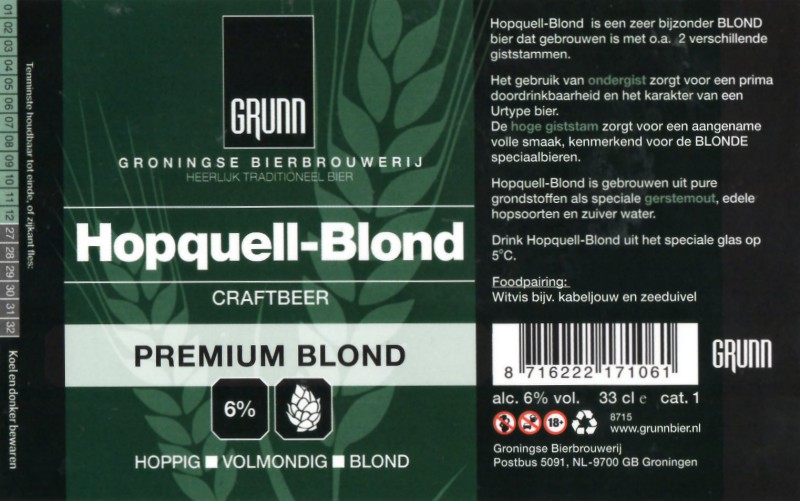 | Biernaam op etiket | Grunn Hopquell-Blond Premium Blond |