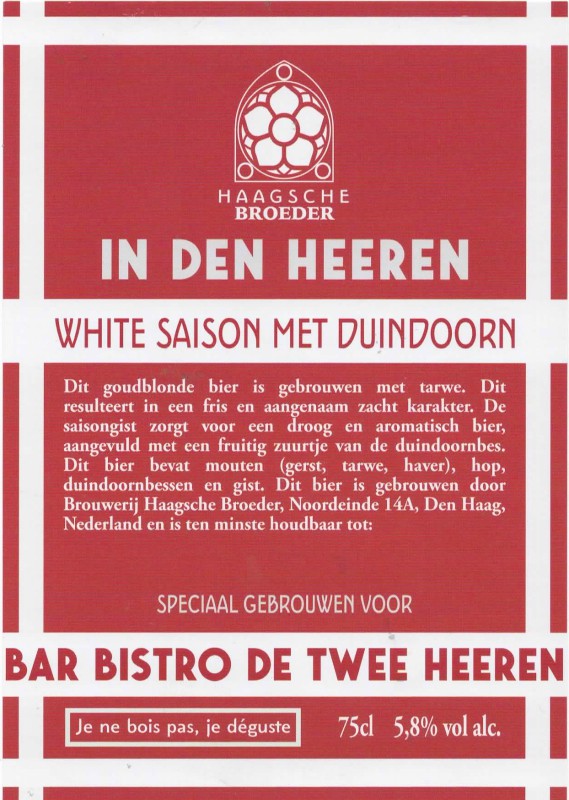 | Biernaam op etiket | In Den Heeren White Saison met Duindoorn |