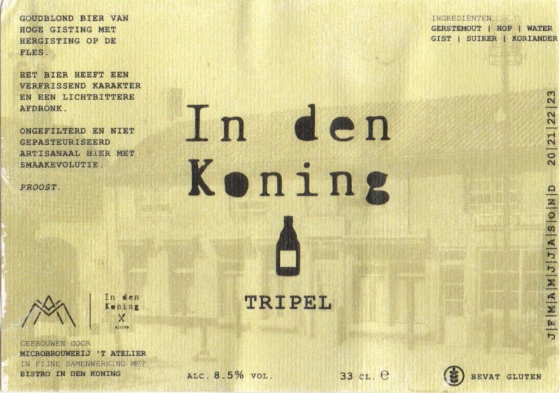 | Omschrijving | Gebrouwen door Microbrouwerij 't Atelier (Gent (B)) In fijne samenwerking met Bistro In den Koning (Waterlandkerkje (Zeeuws-Vlaanderen)) tht 20-23 |