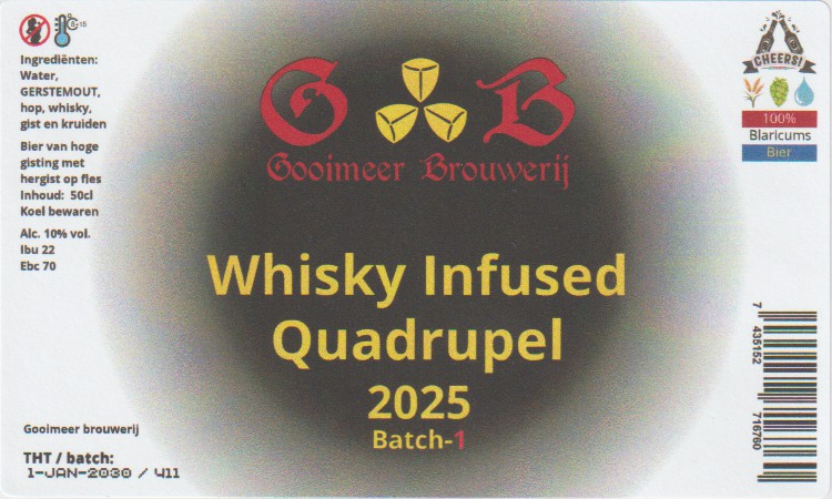| Biernaam op etiket | Whisky Infused Quadrupel 2025 Batch 1 |