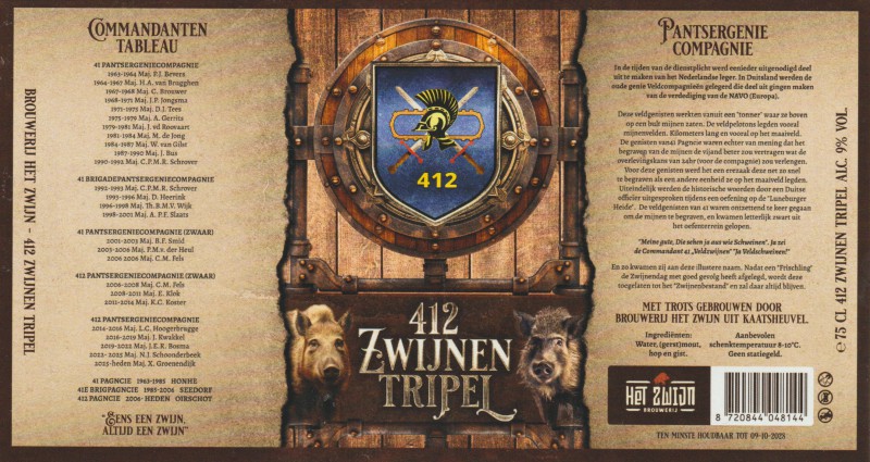 | Biernaam op etiket | 412 Zwijnen Tripel |