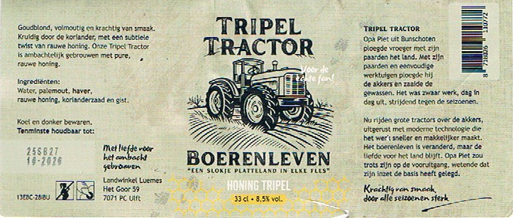 | Biernaam op etiket | Tripel Tractor Boerenleven Honing Tripel |