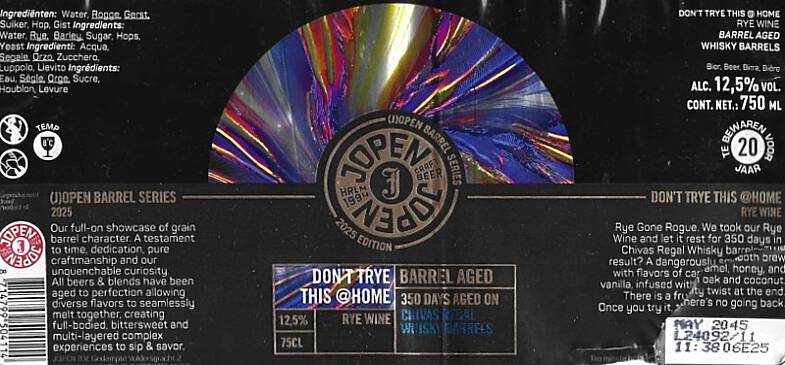 | Omschrijving | Rye Wine Barrel Aged 350 days aged on Chivas Regal Whisky Barrels (J)Open barrels series 2025 |