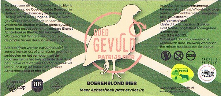 | Biernaam op etiket | Goed Gevuld Patrijs Bier Boerenblond Bier |