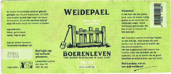 | Biernaam op etiket | Weidepael Boerenleven Pale Ale |