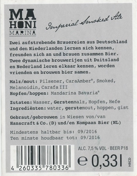 | Biernaam op etiket | Mahoni Marina Imperial Smoked Ale |