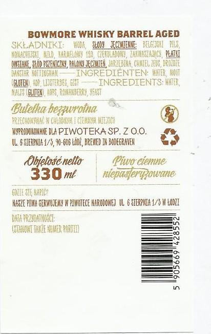 | Biernaam op etiket | ( Mill & Wherry ) Bowmore Whisky Barrel Aged |