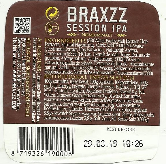| Biernaam op etiket | Braxzz Session IPA Premium Malt |