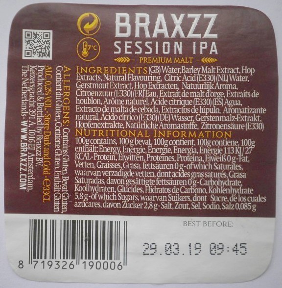 | Biernaam op etiket | Braxzz Session IPA Premium Malt |