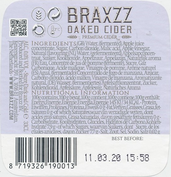 | Biernaam op etiket | Braxzz Oaked Cider Premium Cider |