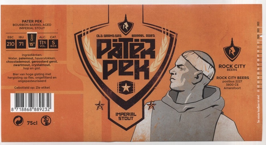 | Biernaam op etiket | Pater Pek Imperial Stout Old Grand-dad barrel aged |