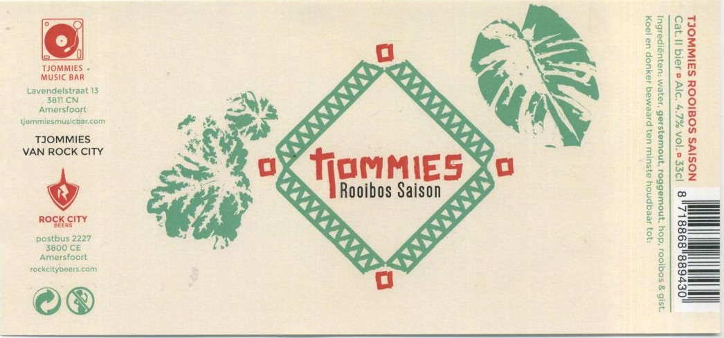 | Biernaam op etiket | Tjommies Rooibos Saison |