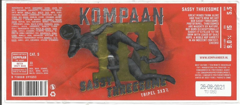 | Biernaam op etiket | Sassy Threesome Tripel |