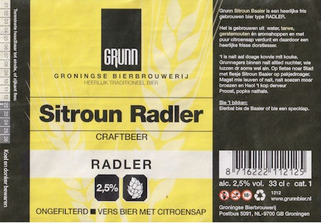 | Biernaam op etiket | Grunn Sitroun Radler |