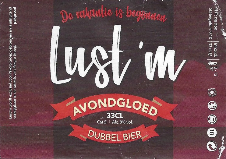 | Biernaam op etiket | Lust'm Avondgloed Dubbel Bier |